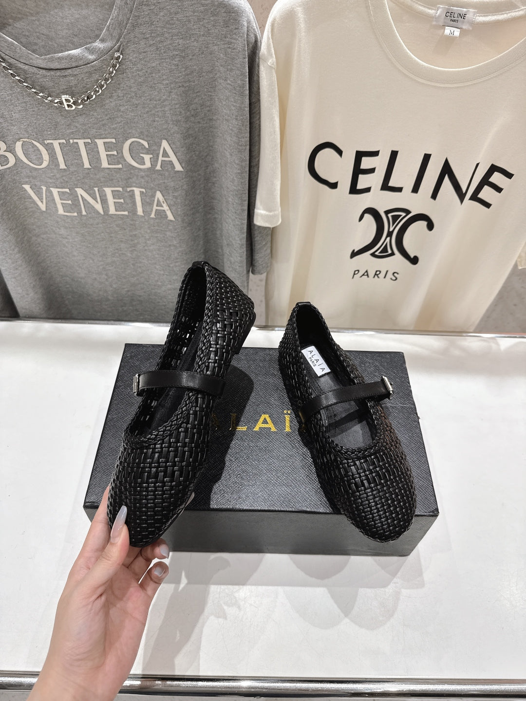 ALAIA MARY JANE FLATS black woven calfskin pattent