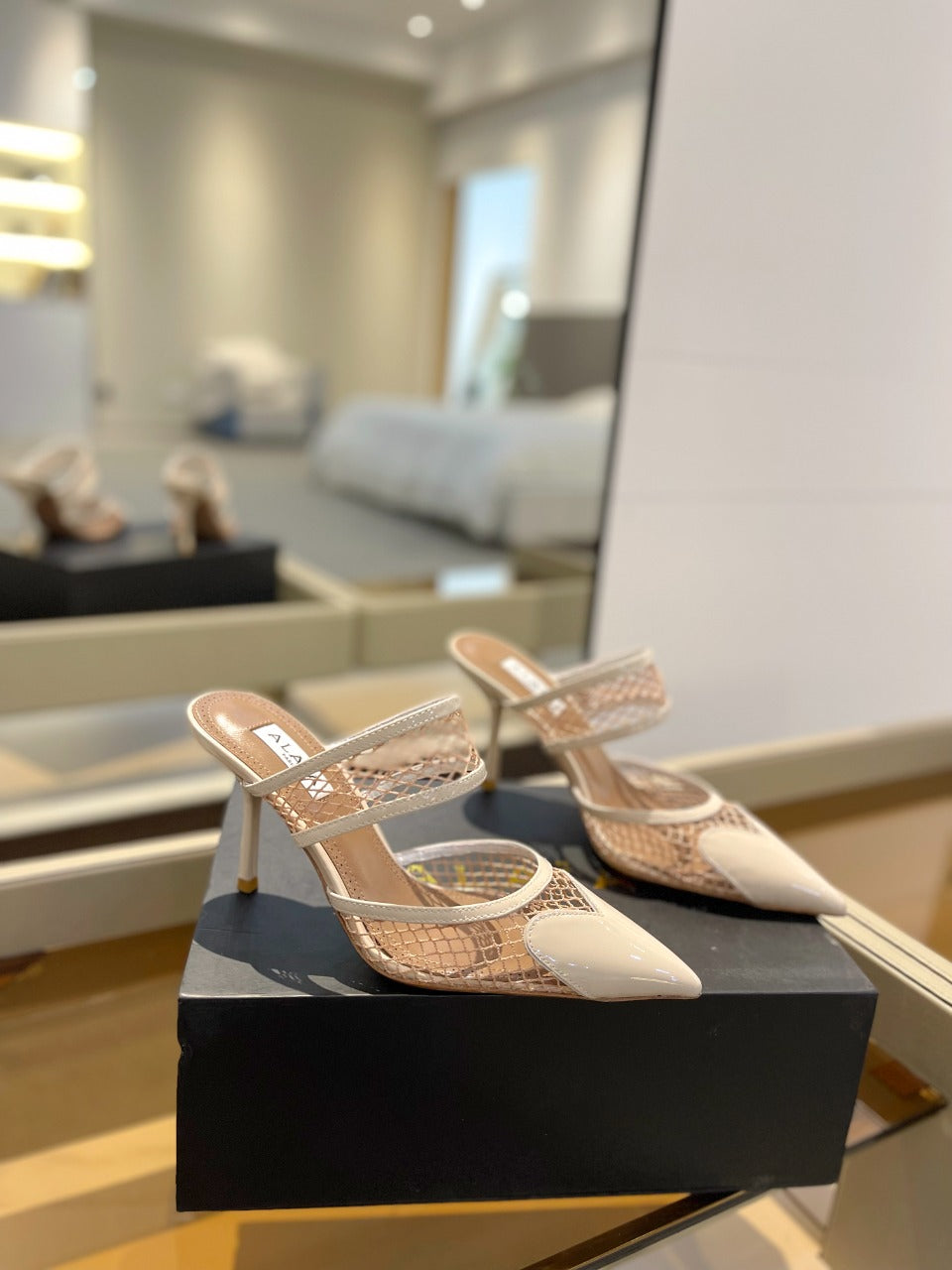 alaia mule 85 fishnet cream heart lambskin