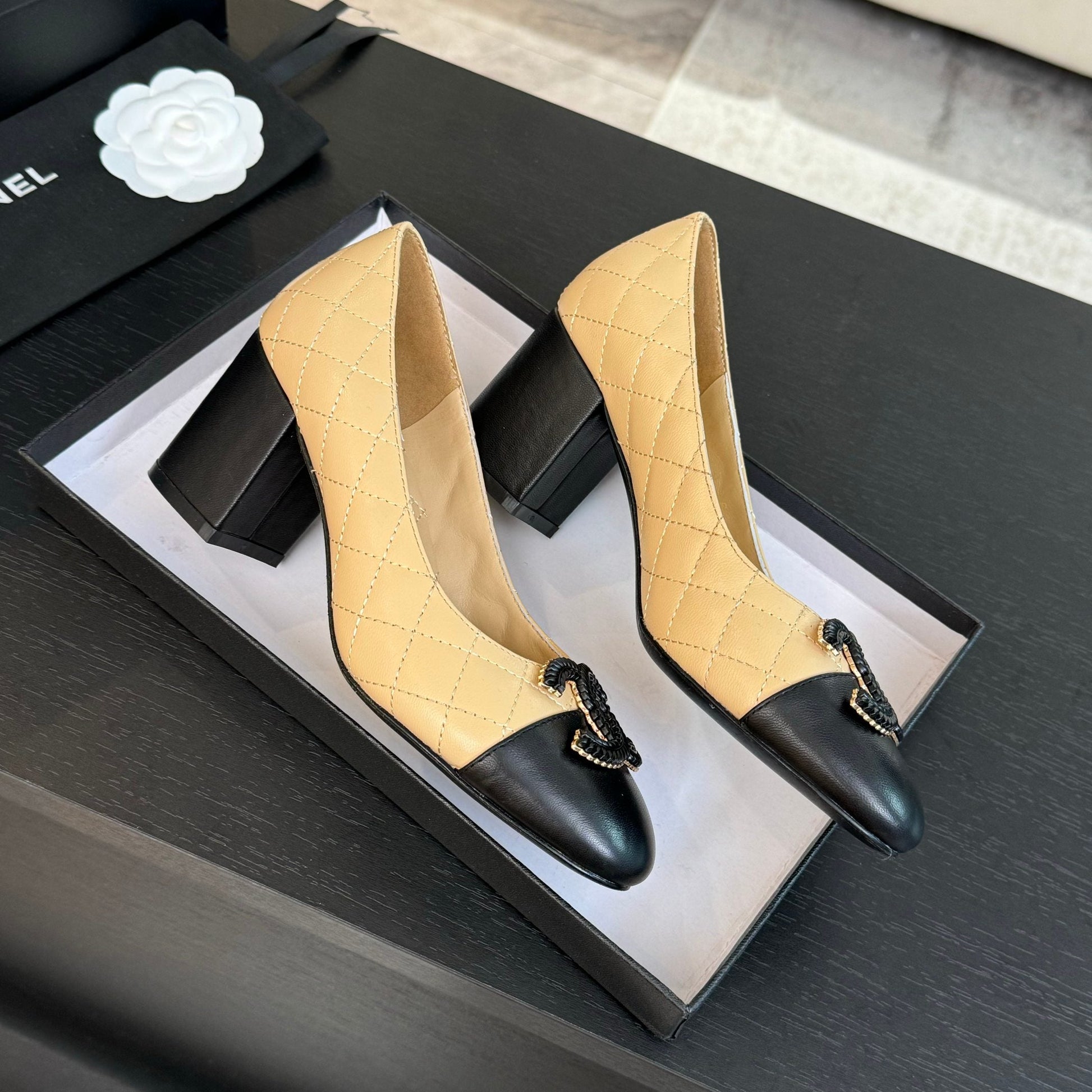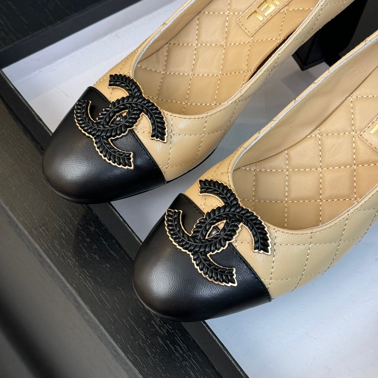 ballet flat with high heel 7cm beige black quilted lambskin