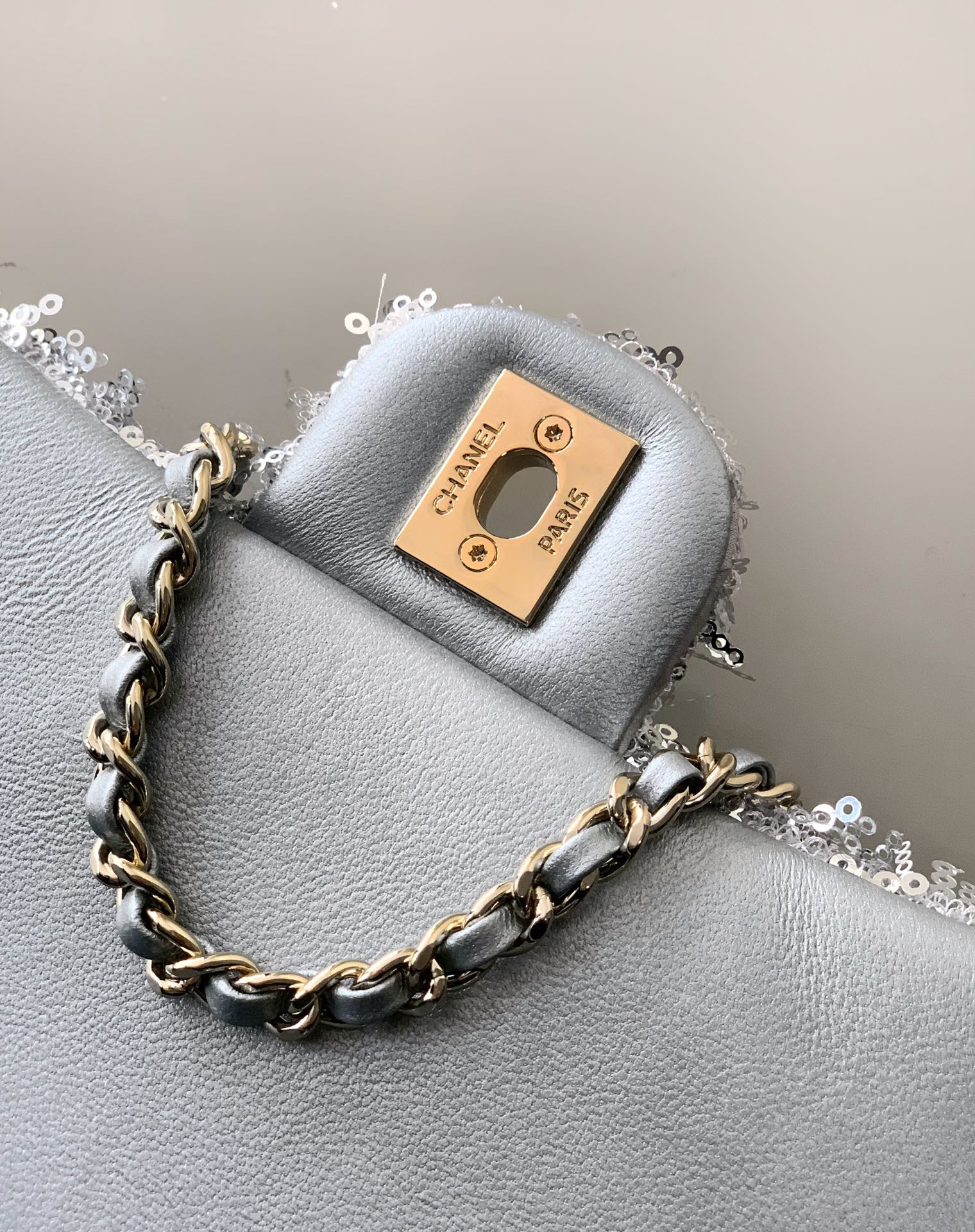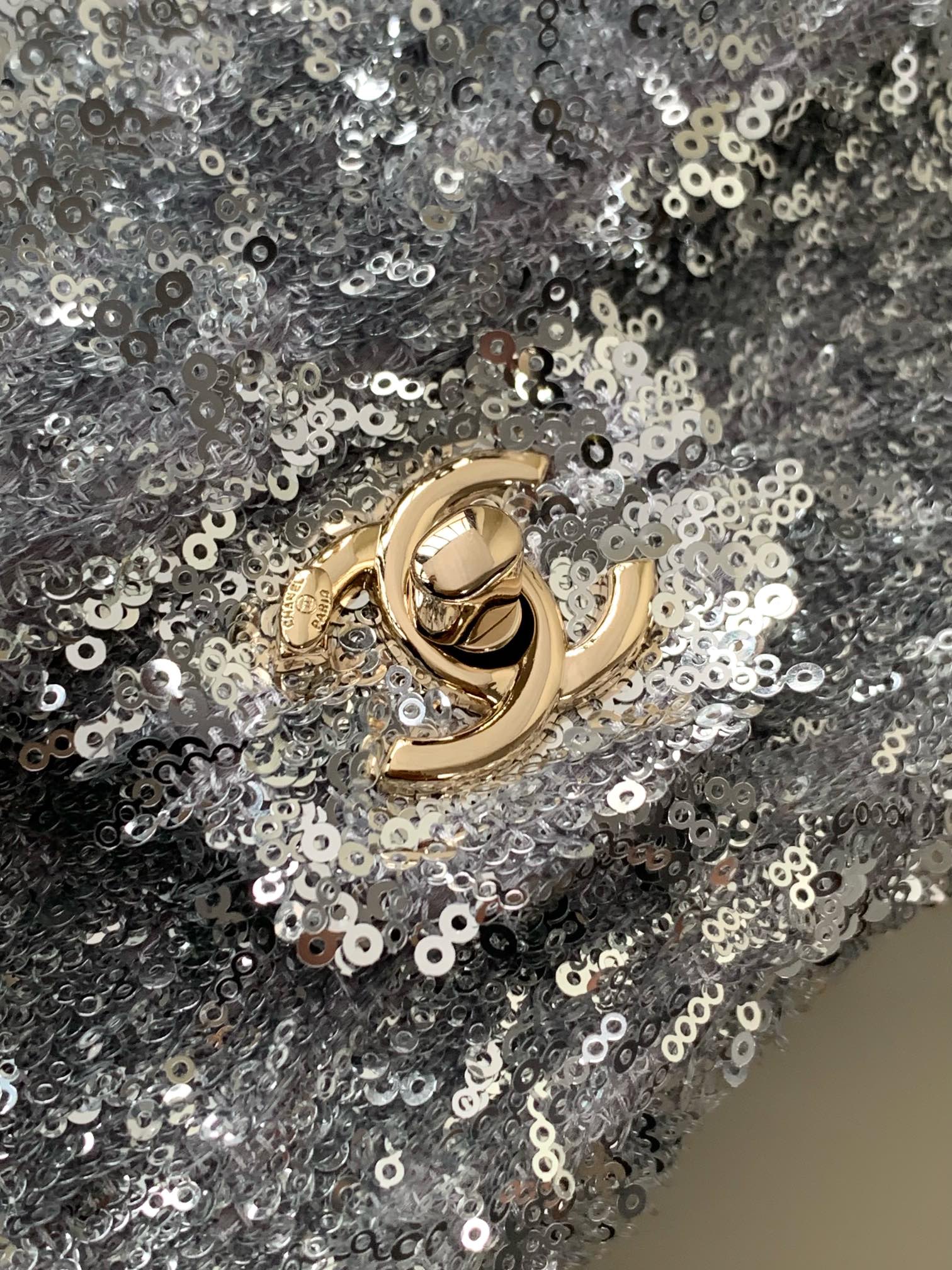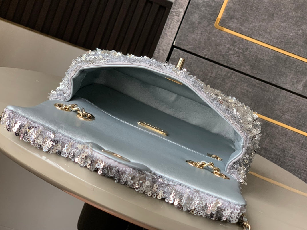 CC 25S Flap Bag 20cm Grey Fringed Sequin Calfskin