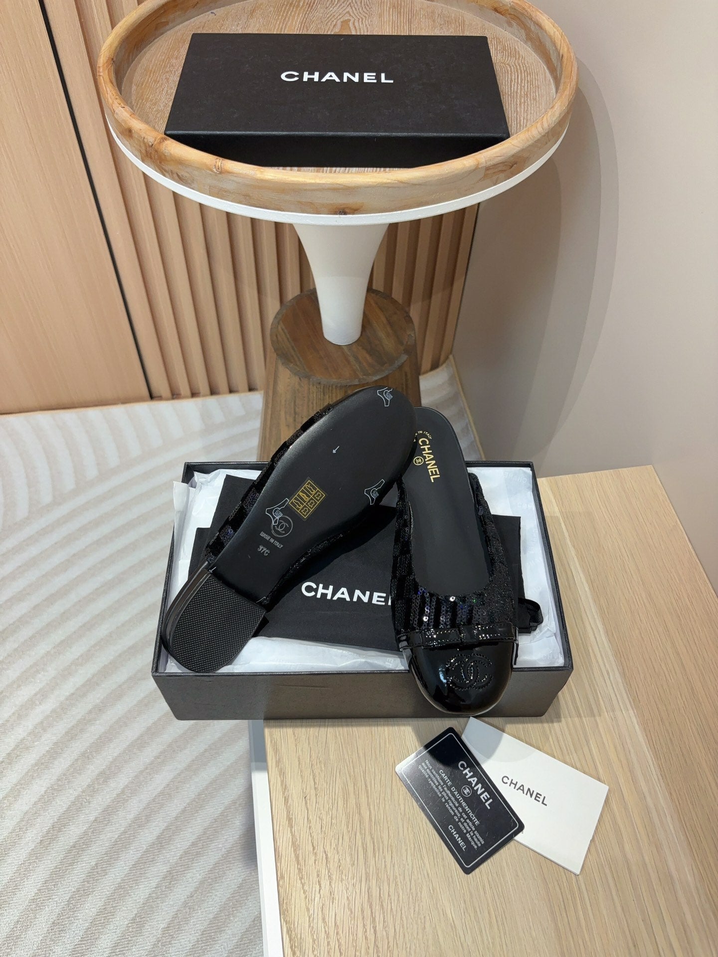 cc mule black tweed sequin black patent calfskin