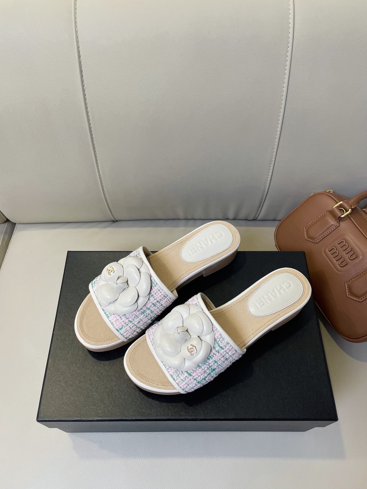 cc mule sandal 45 pink blue fabric beige calfskin