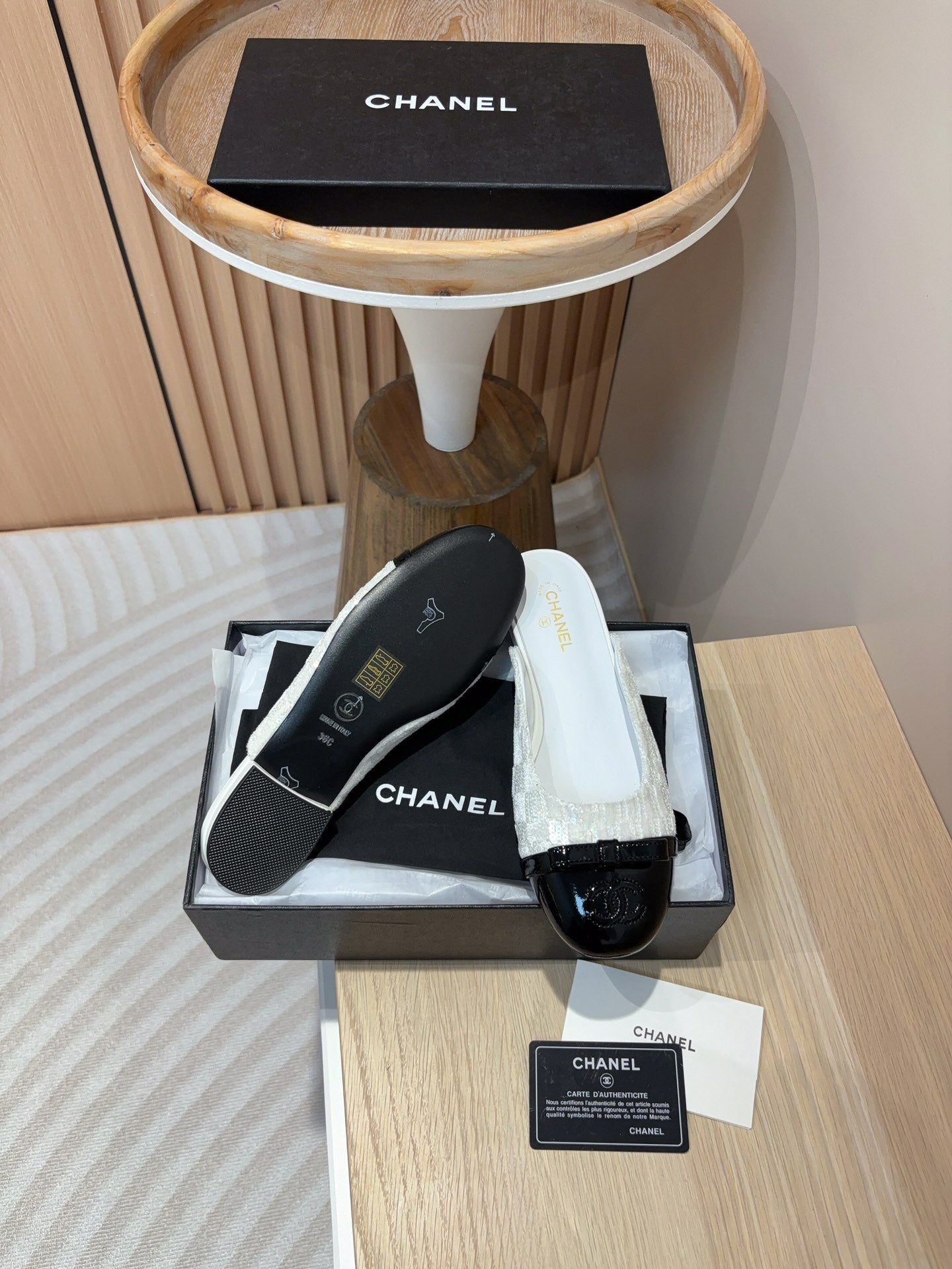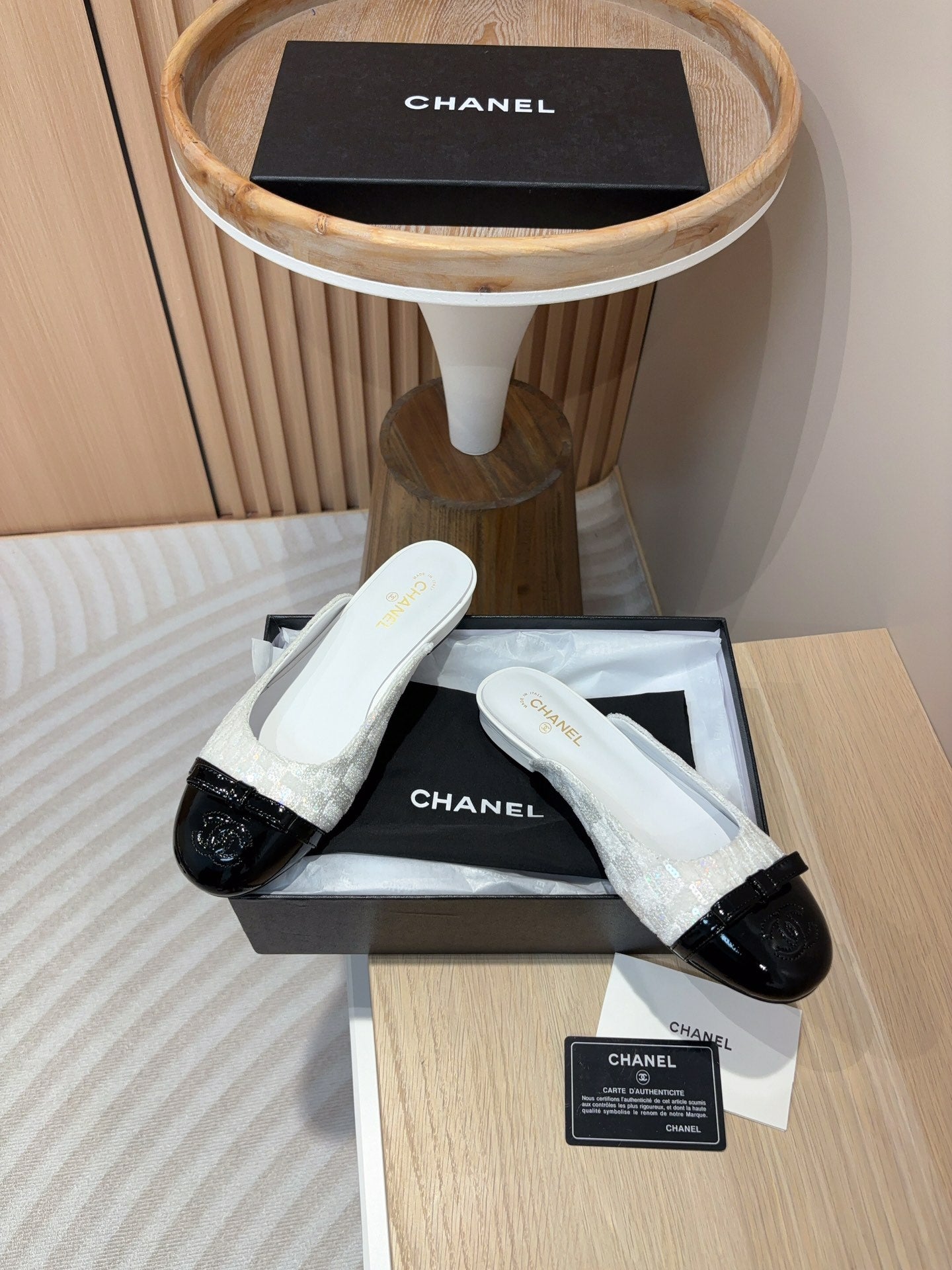 cc mule white tweed sequin black patent calfskin