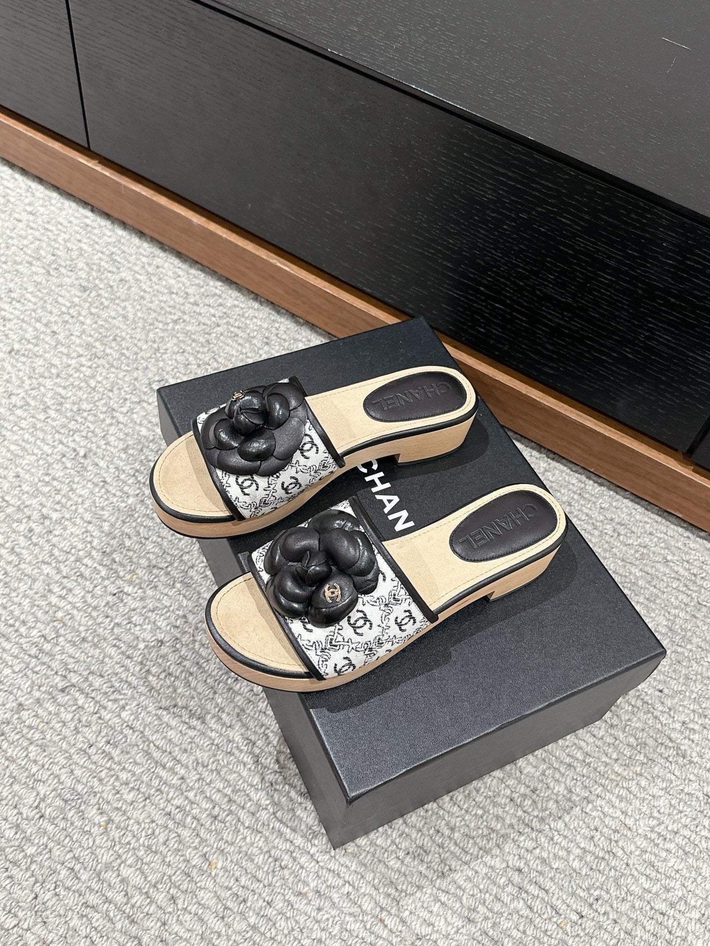 cc sandal flower white canvas black calfskin