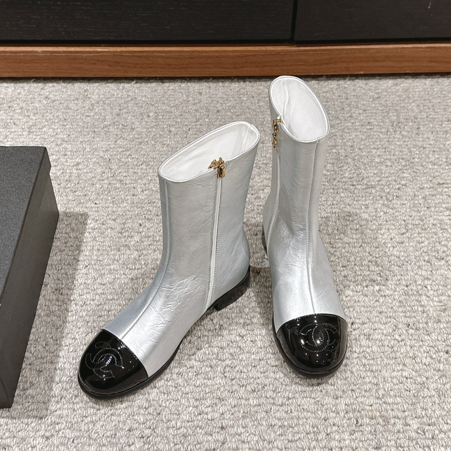 CC Short Boot Silver Metalic Lambskin Black Patent Calfskin