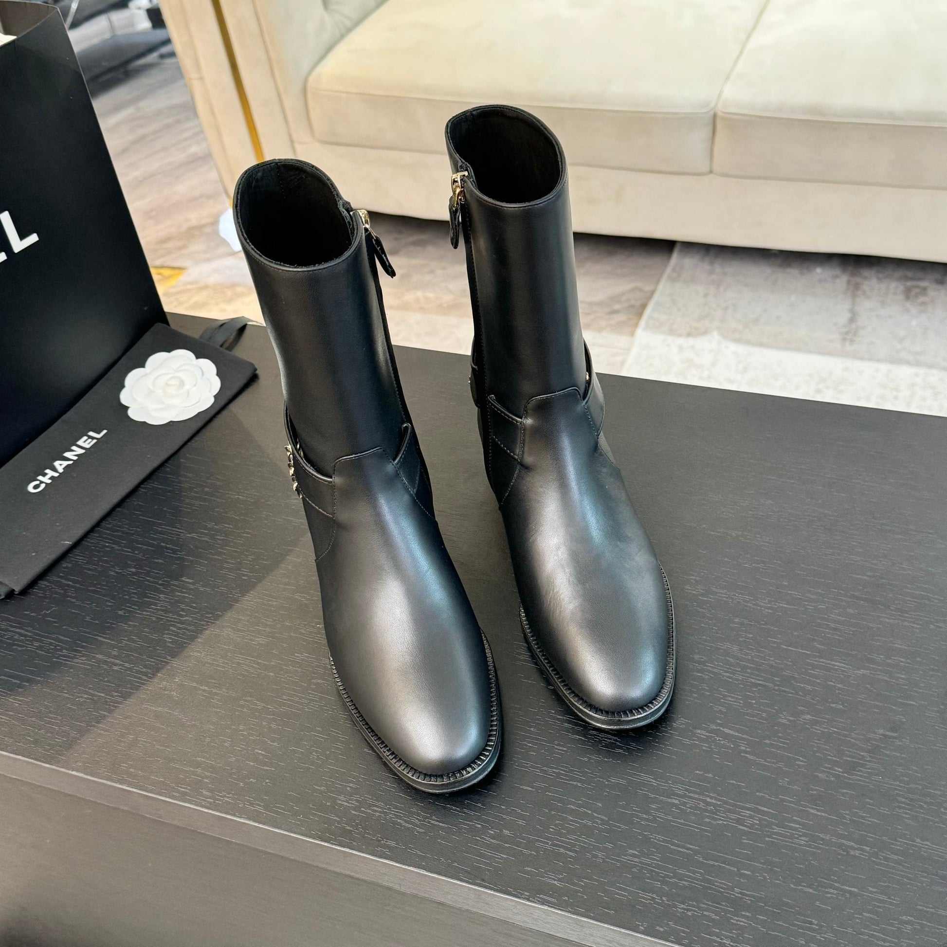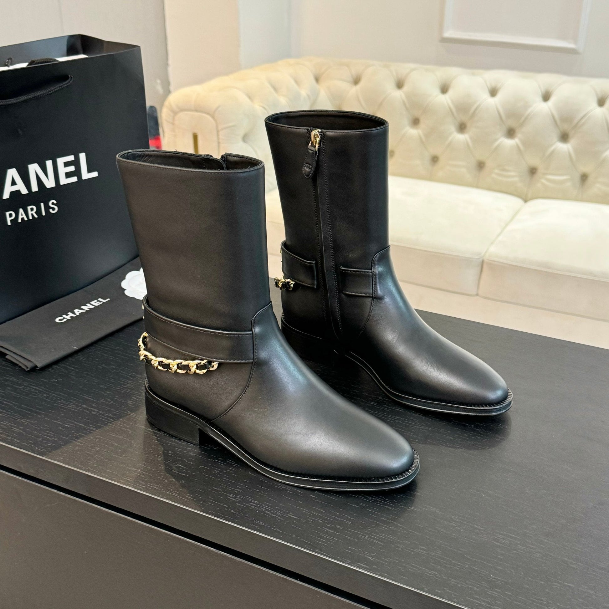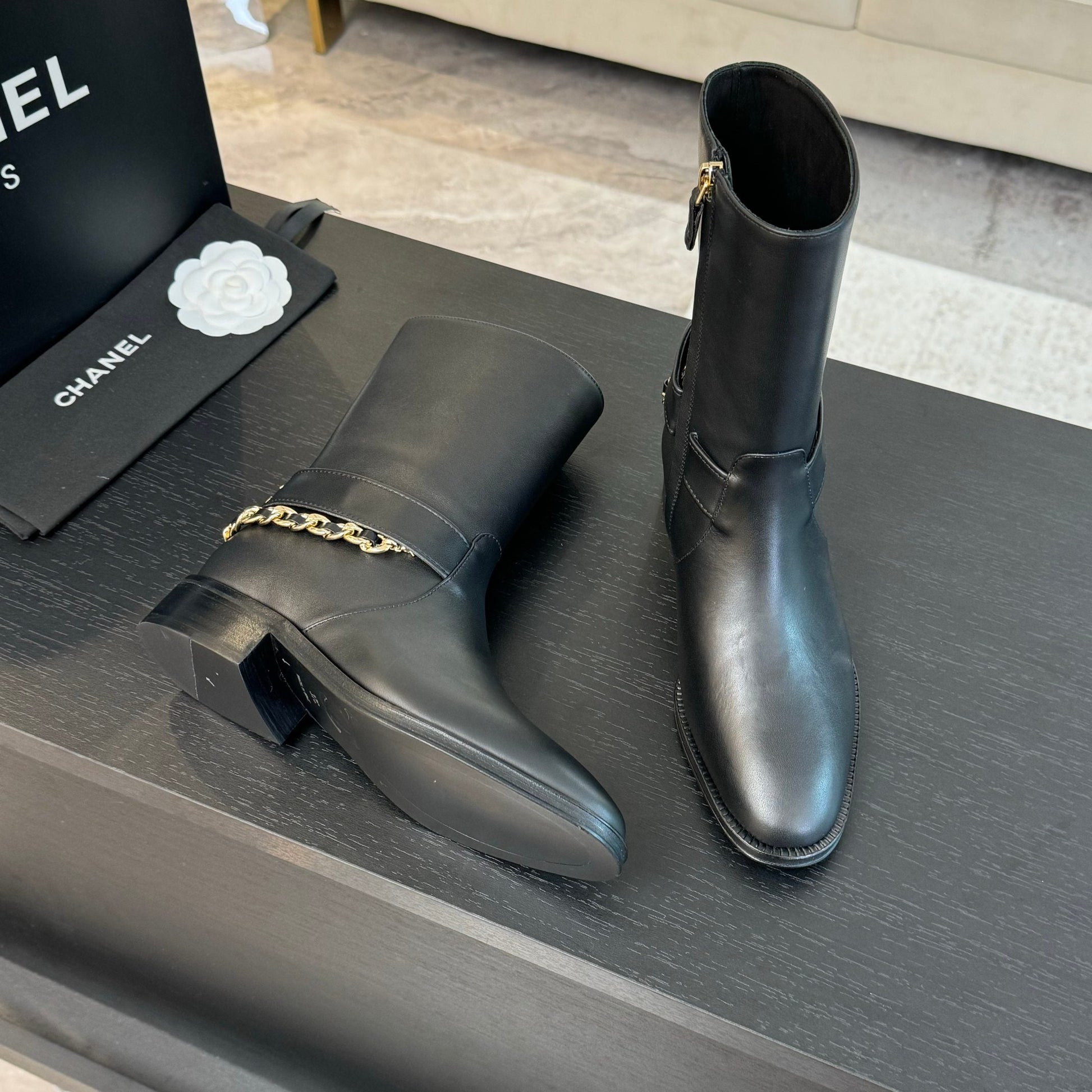 CC Short Boots 30mm Plain Black Chain Cowhide