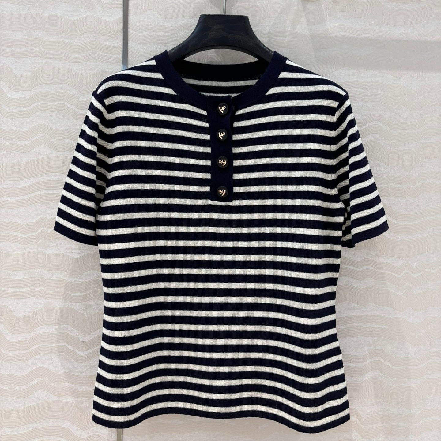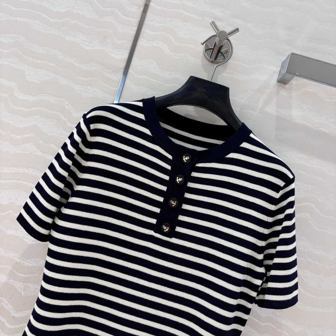 CD Striped Round-neck Knitted Top Navy Blue White Tencel
