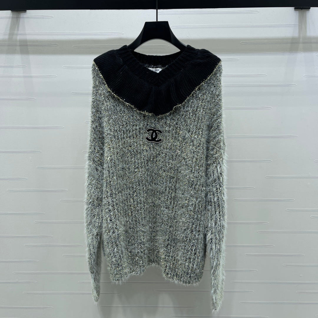 Chanel 2025 Ruffled Collar Shimmering Sweater Gray Black Polyester Wool 319566