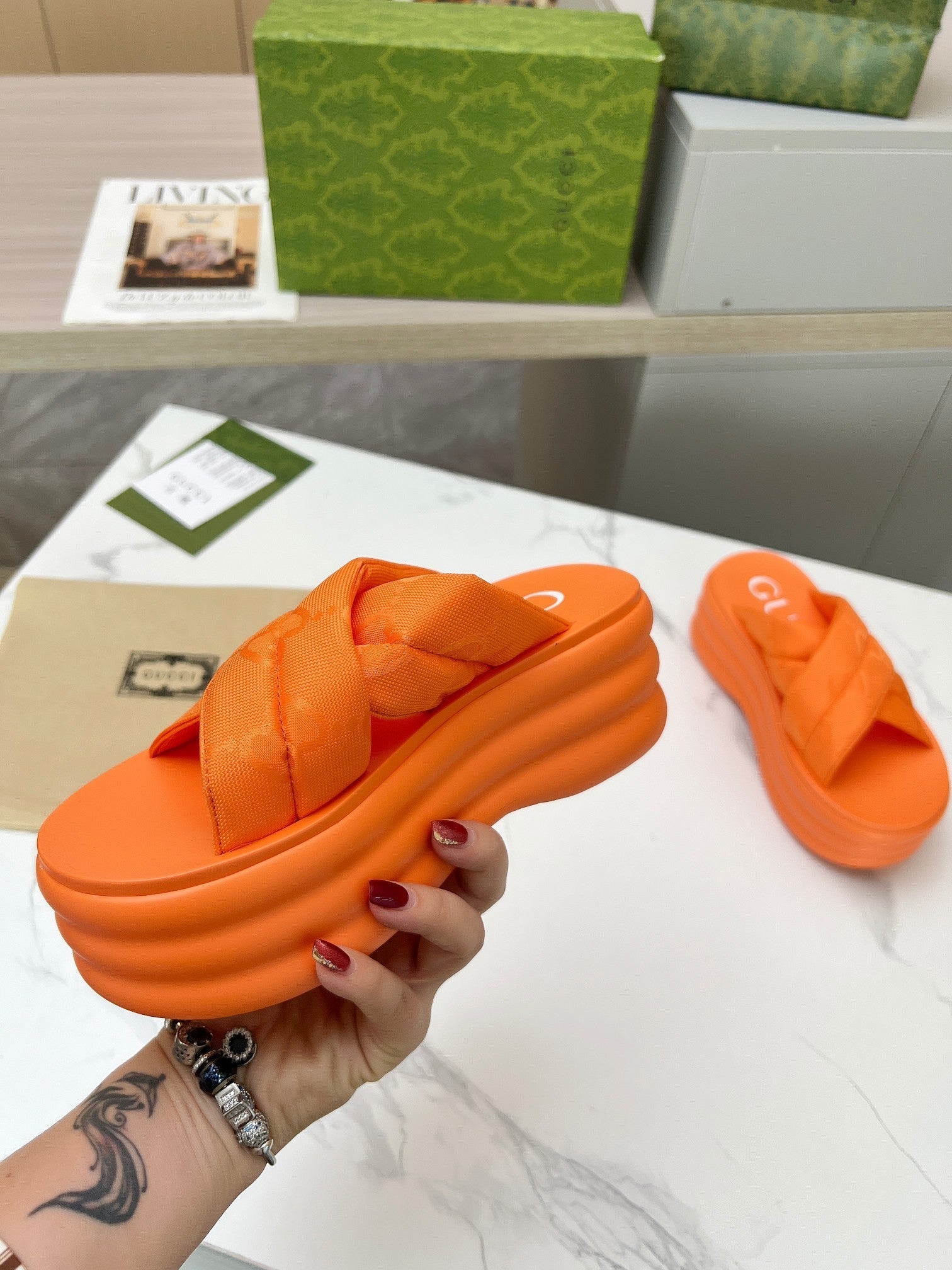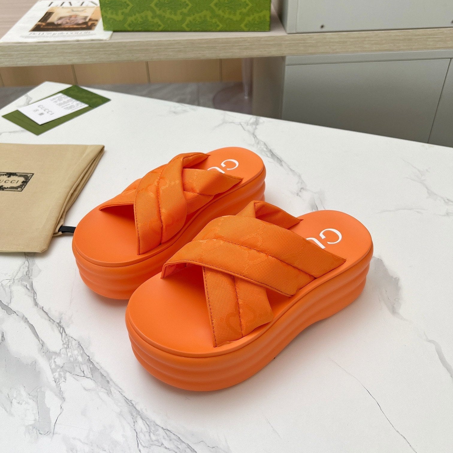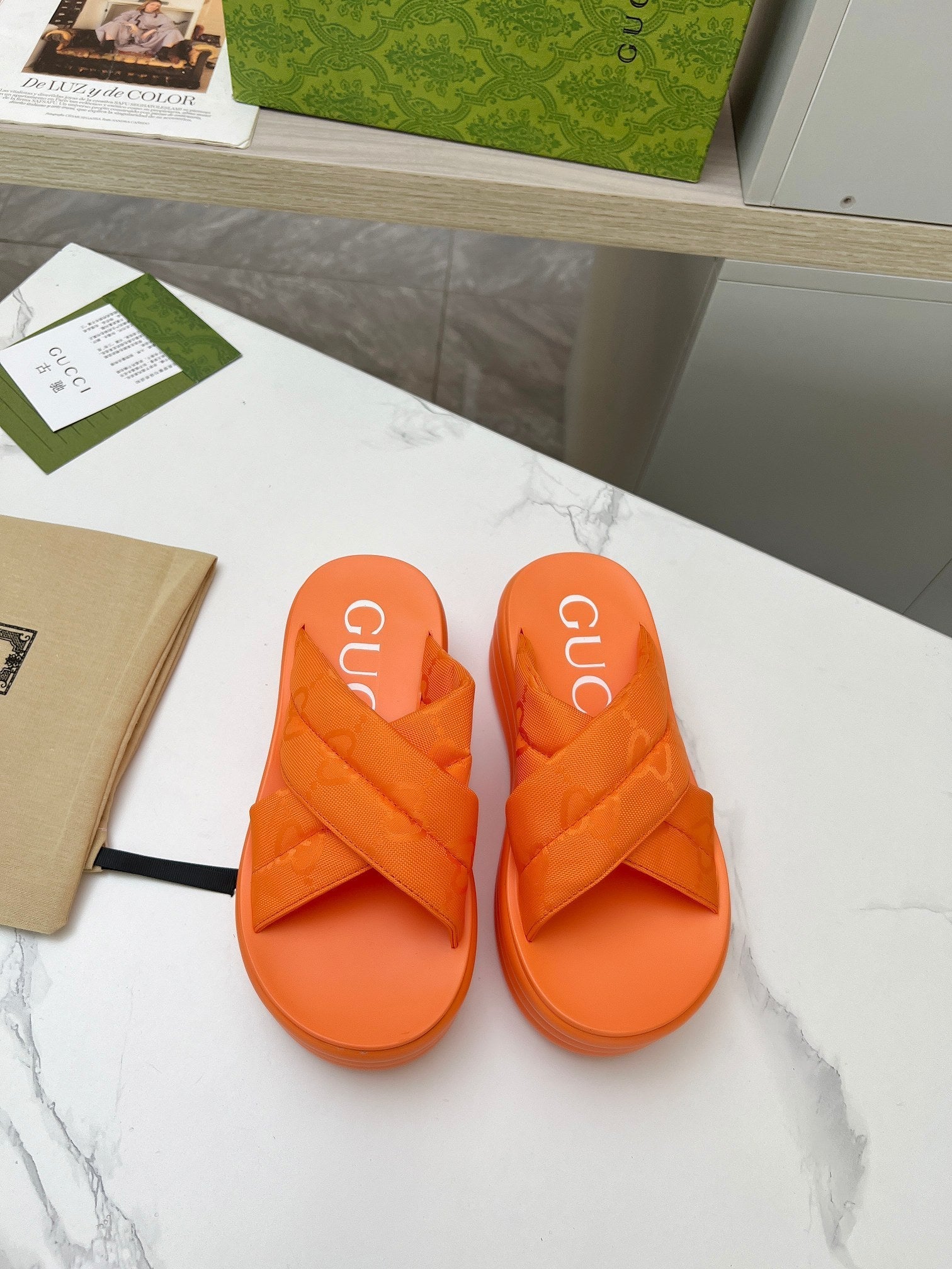 GG waterproof platform slippers orange fabric