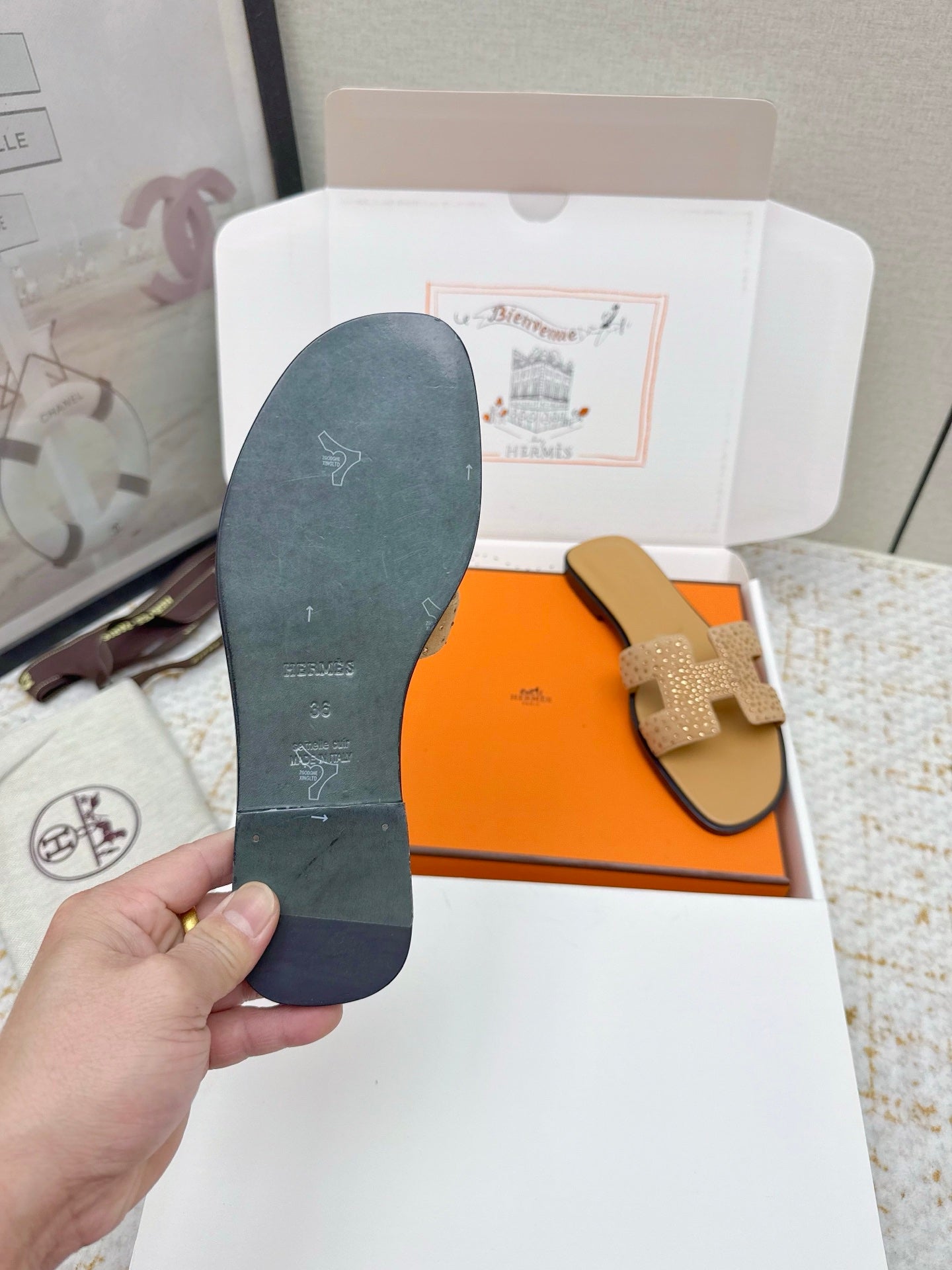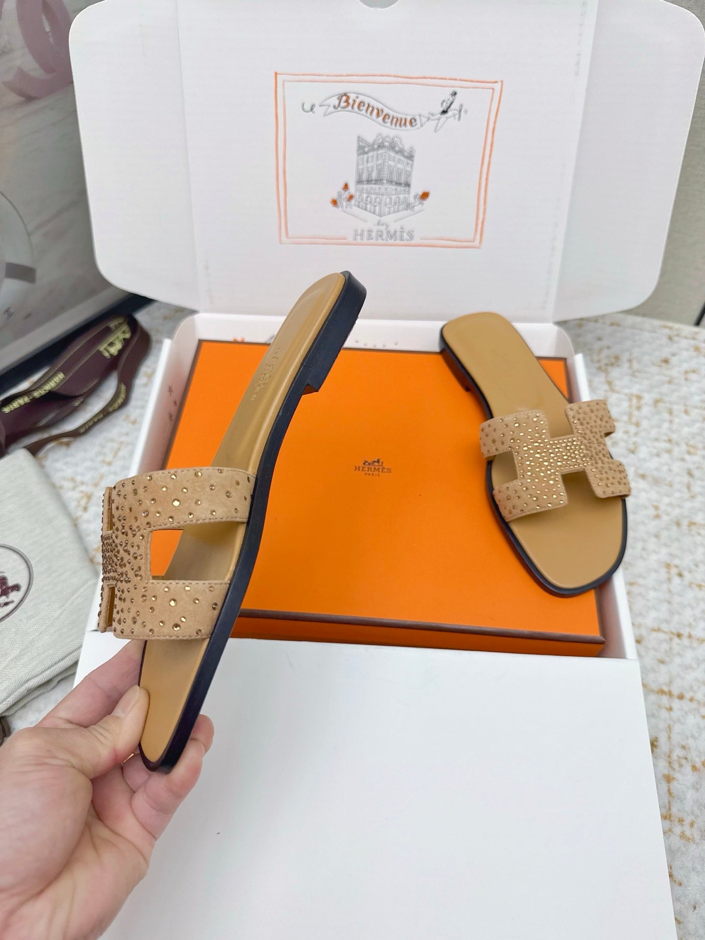 HM 26ss Oran Sandals Beige Gold Crystal Suede Cowhide 625254