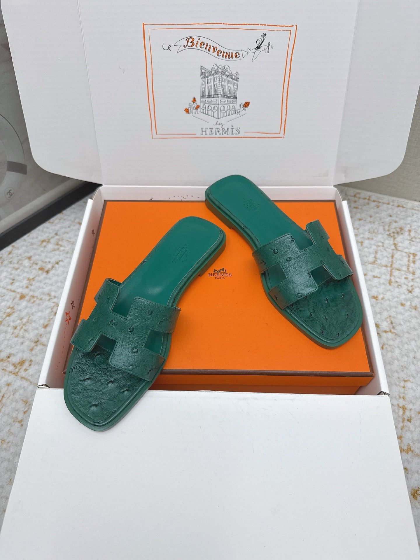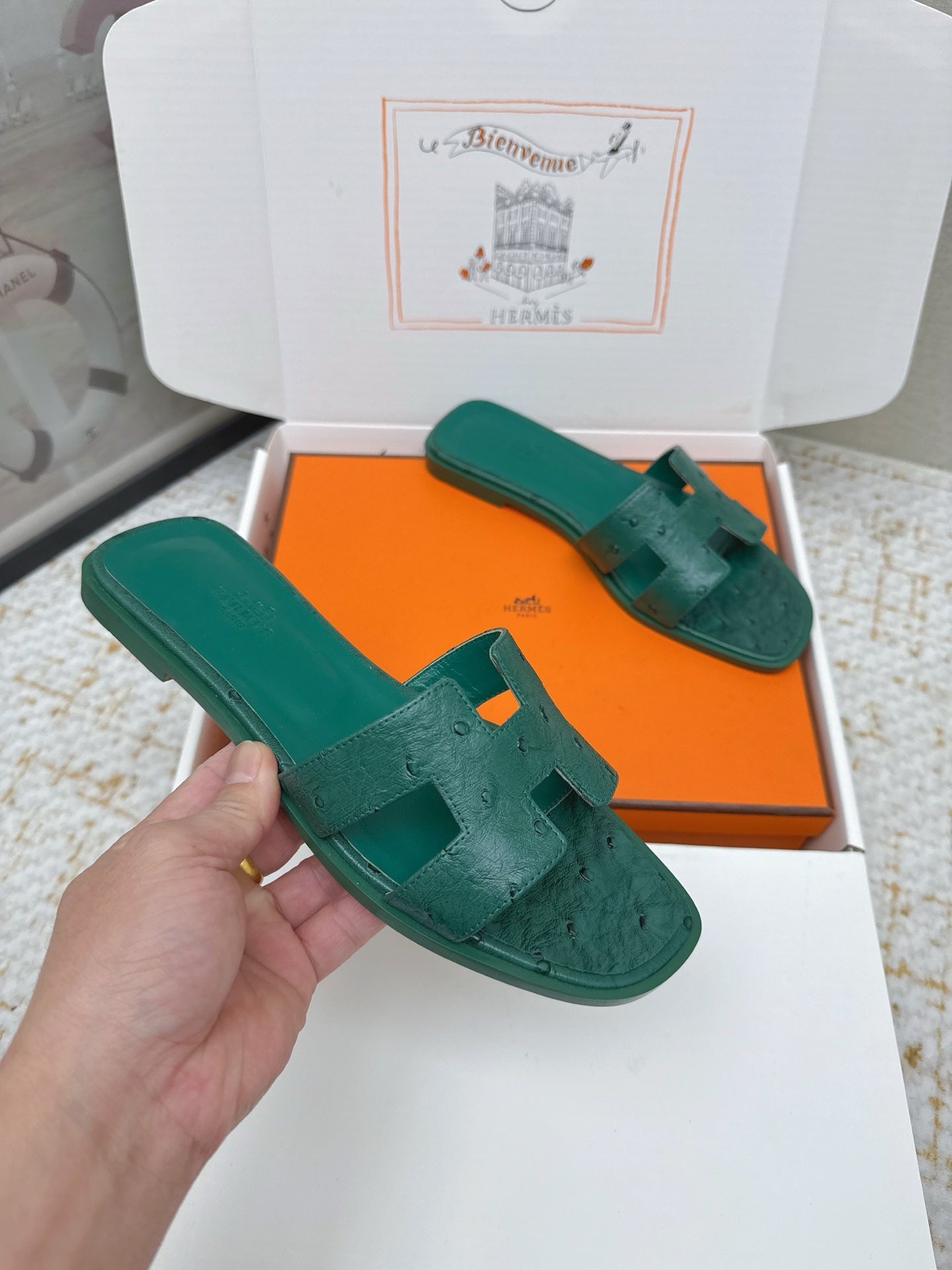 HM 26ss Oran Sandals Forest Green Ostrich Leather 625108