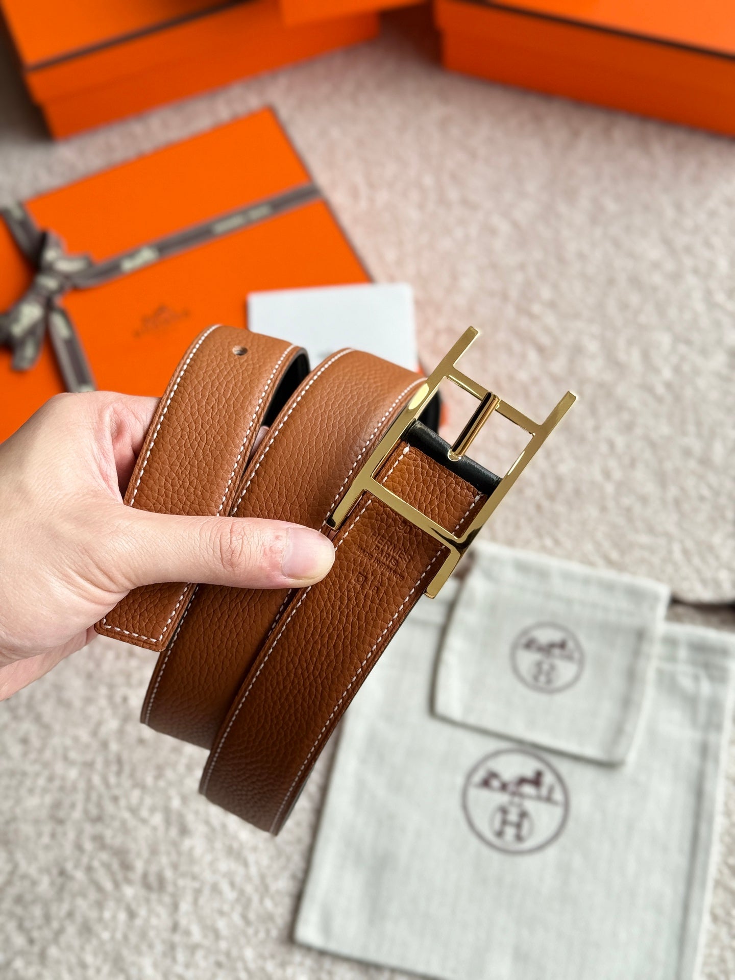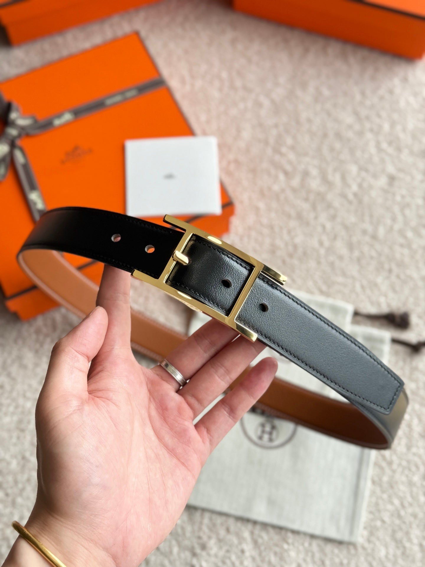 HM Gold Quentin Reversible 32mm Belt Black Brown Leather 188088