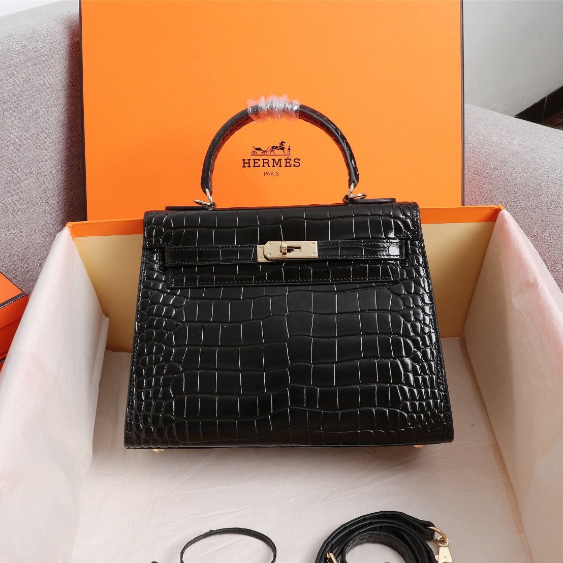 HM KELLY BAG 25 BLACK CROCODILE EMBOSSED CALFSKIN
