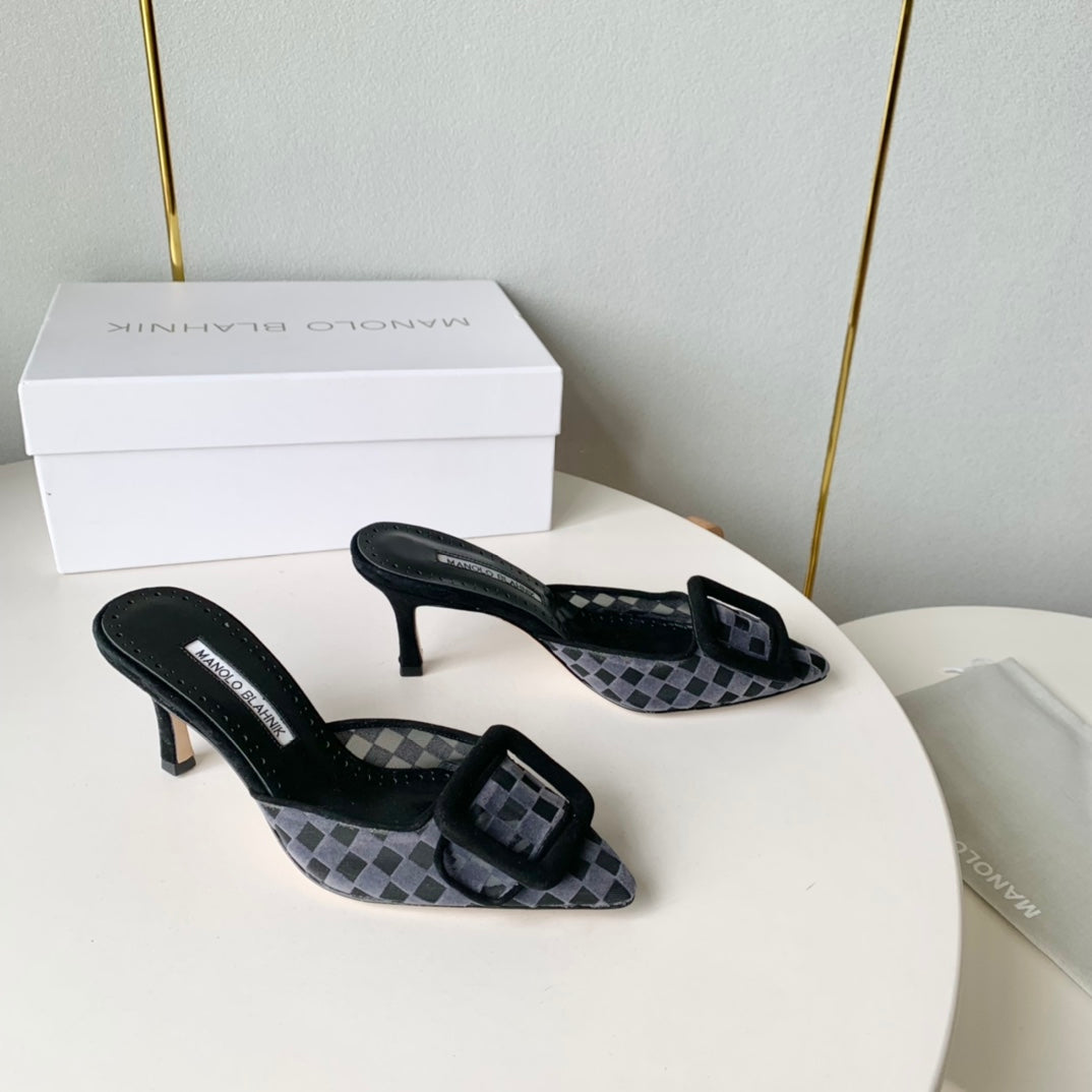 Manolo Mules Latest Checkerboard Grey Fabric Leather 528009