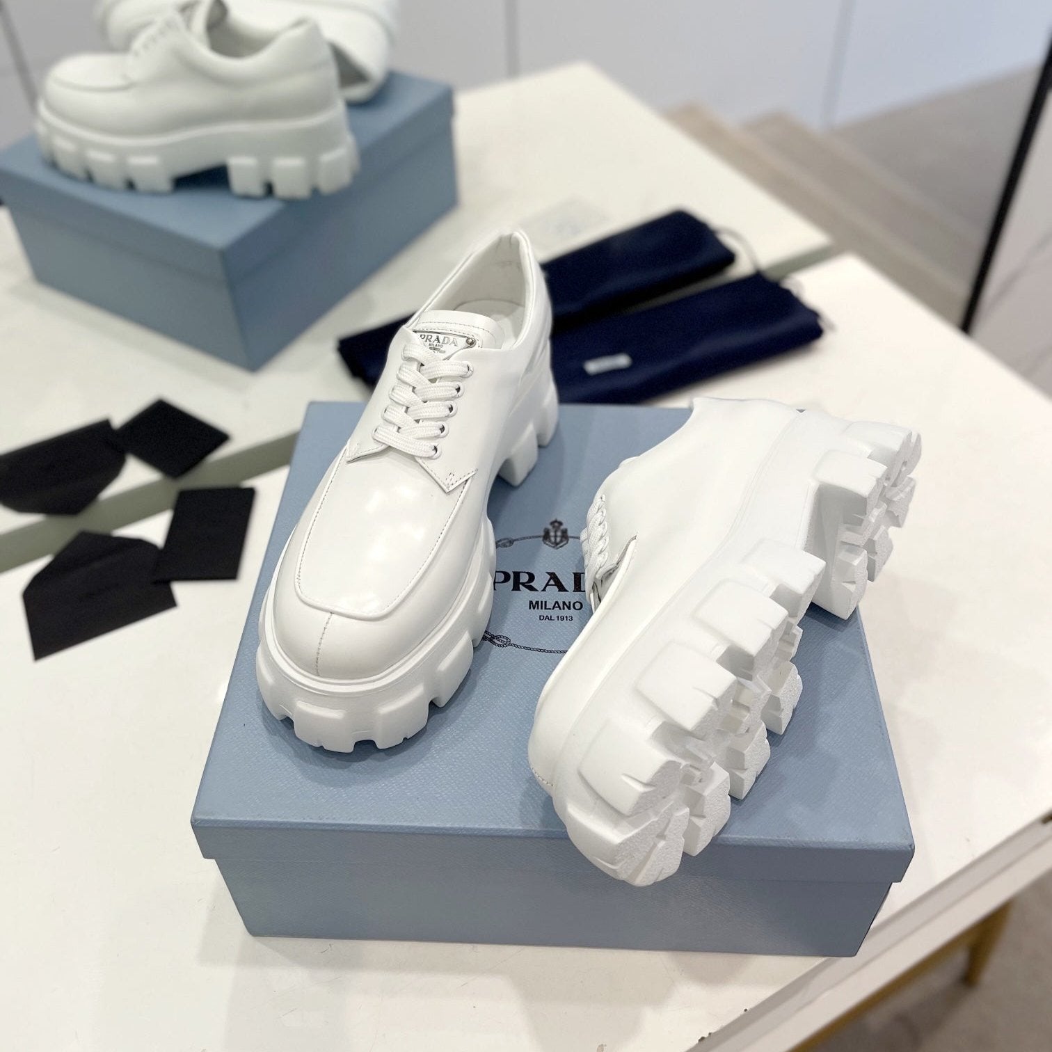 MONOLITH LACE-UP LOAFER IN WHITE CALFSKIN ATTACHED TRIANGLE LOGO