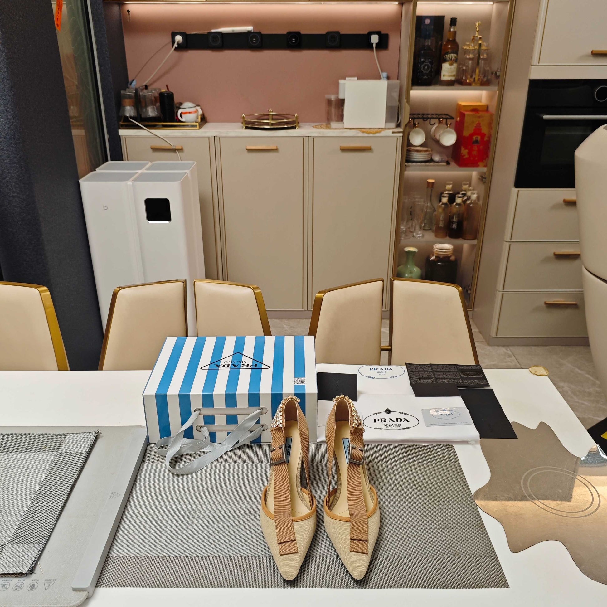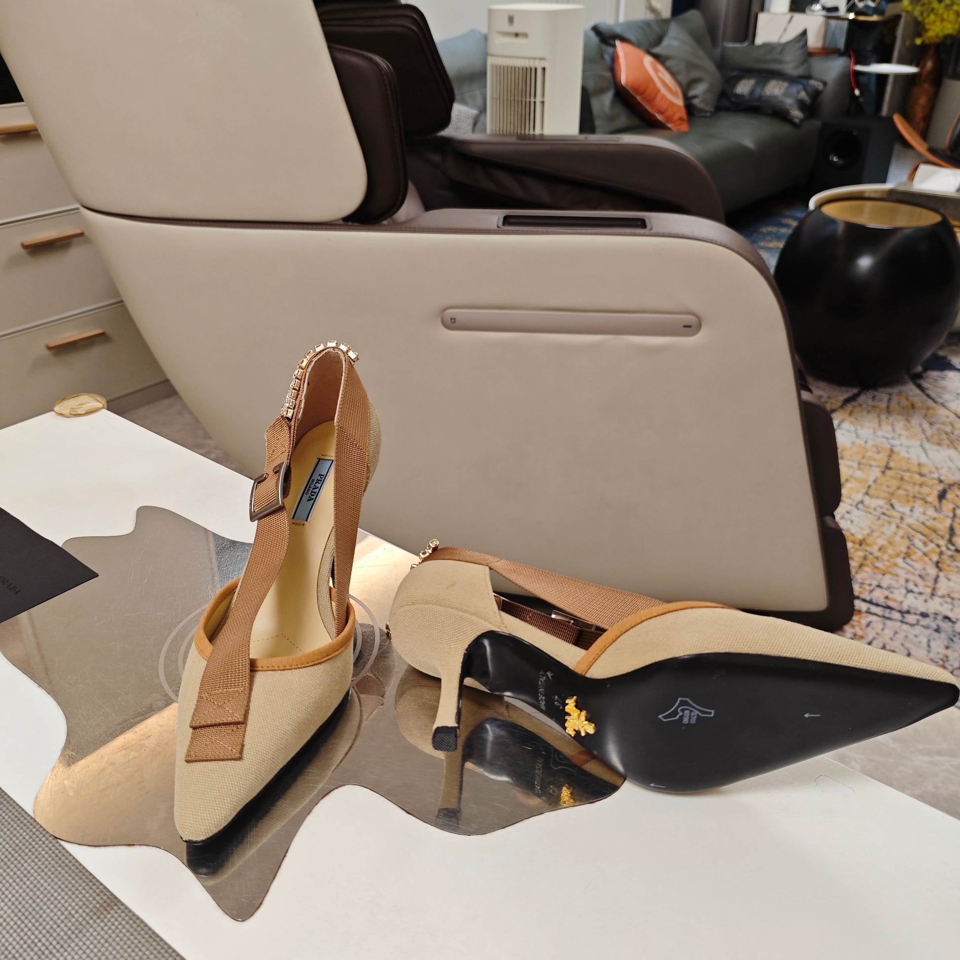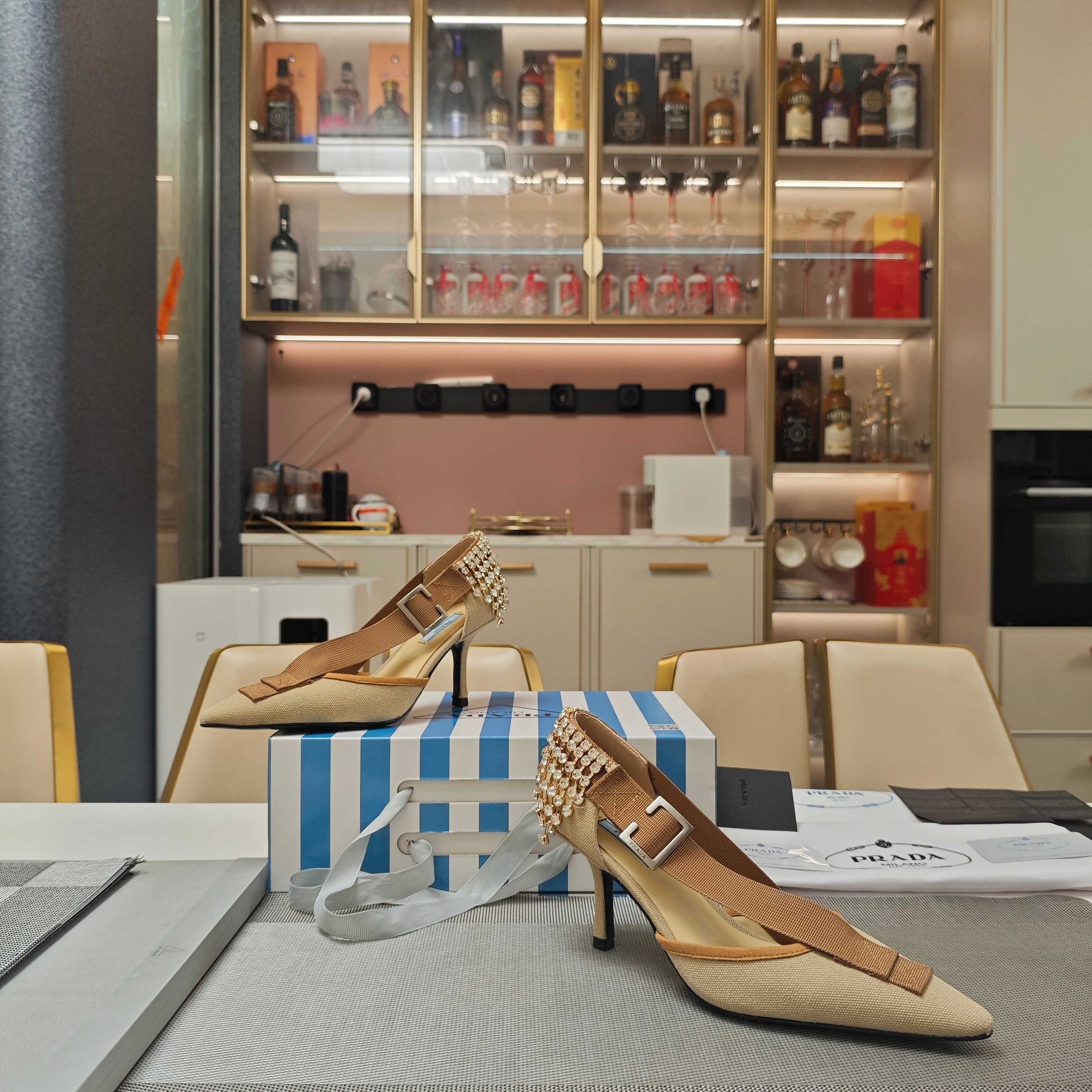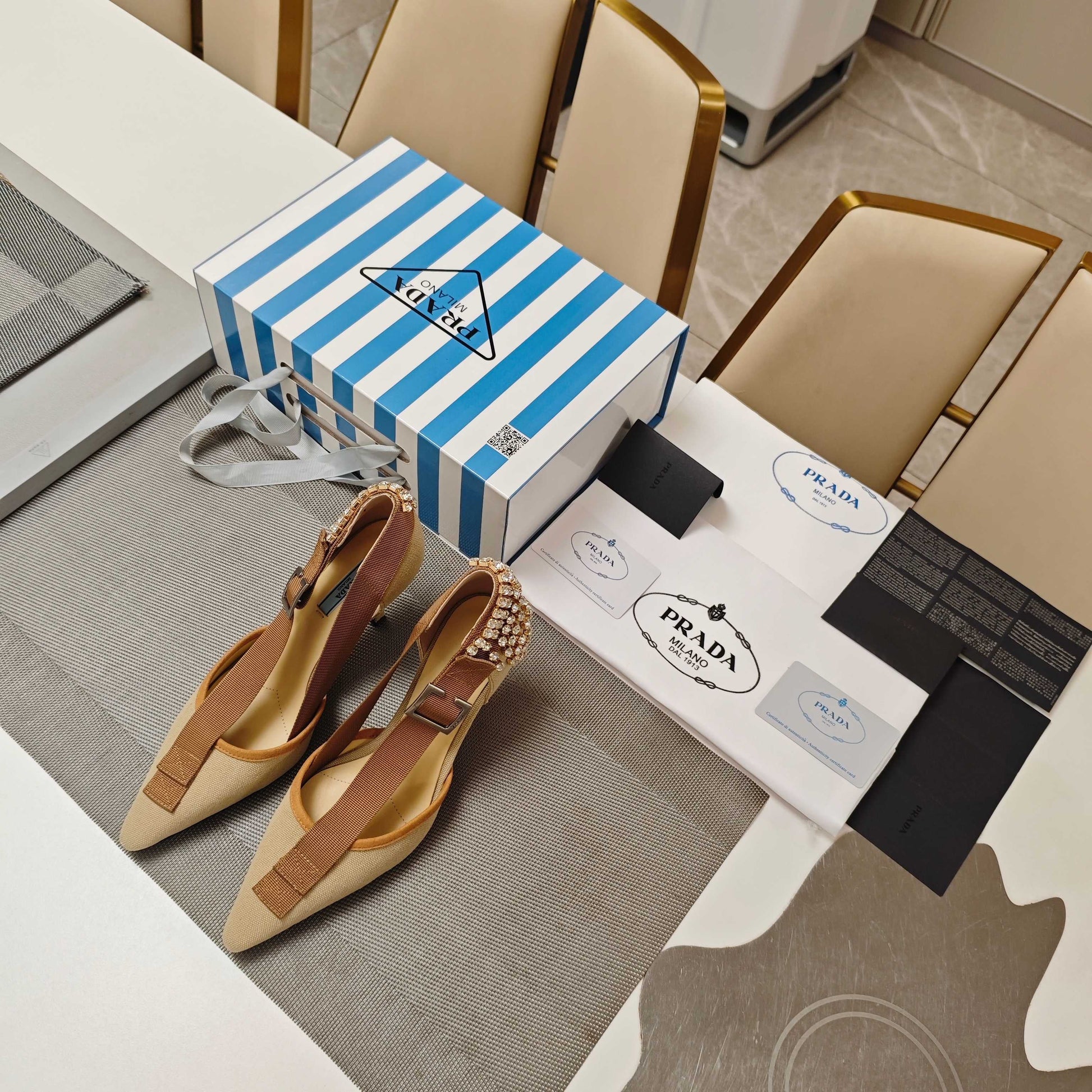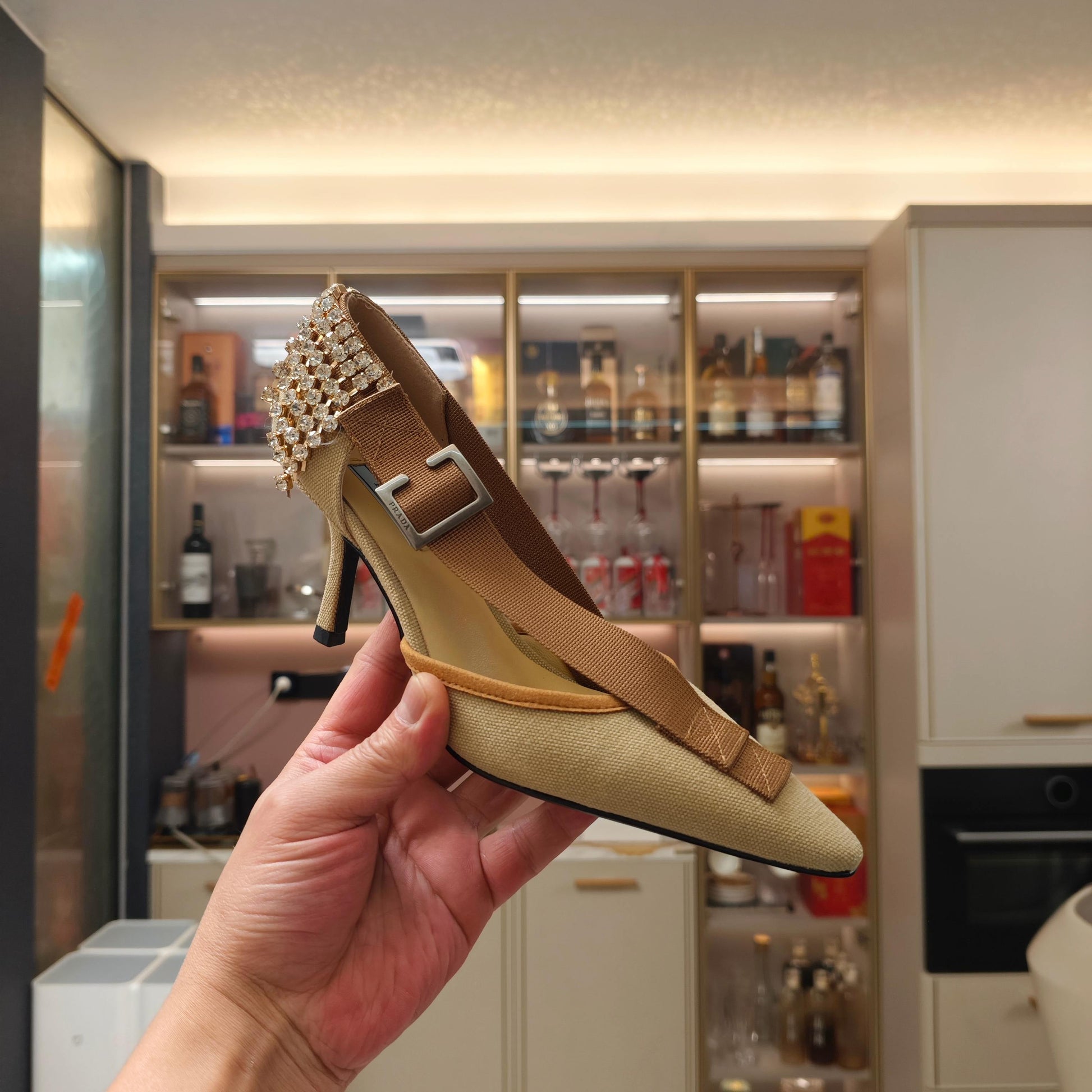 PRA 26S High Heel Pump 70 Beige Brown Canvas Rhinestones 630570