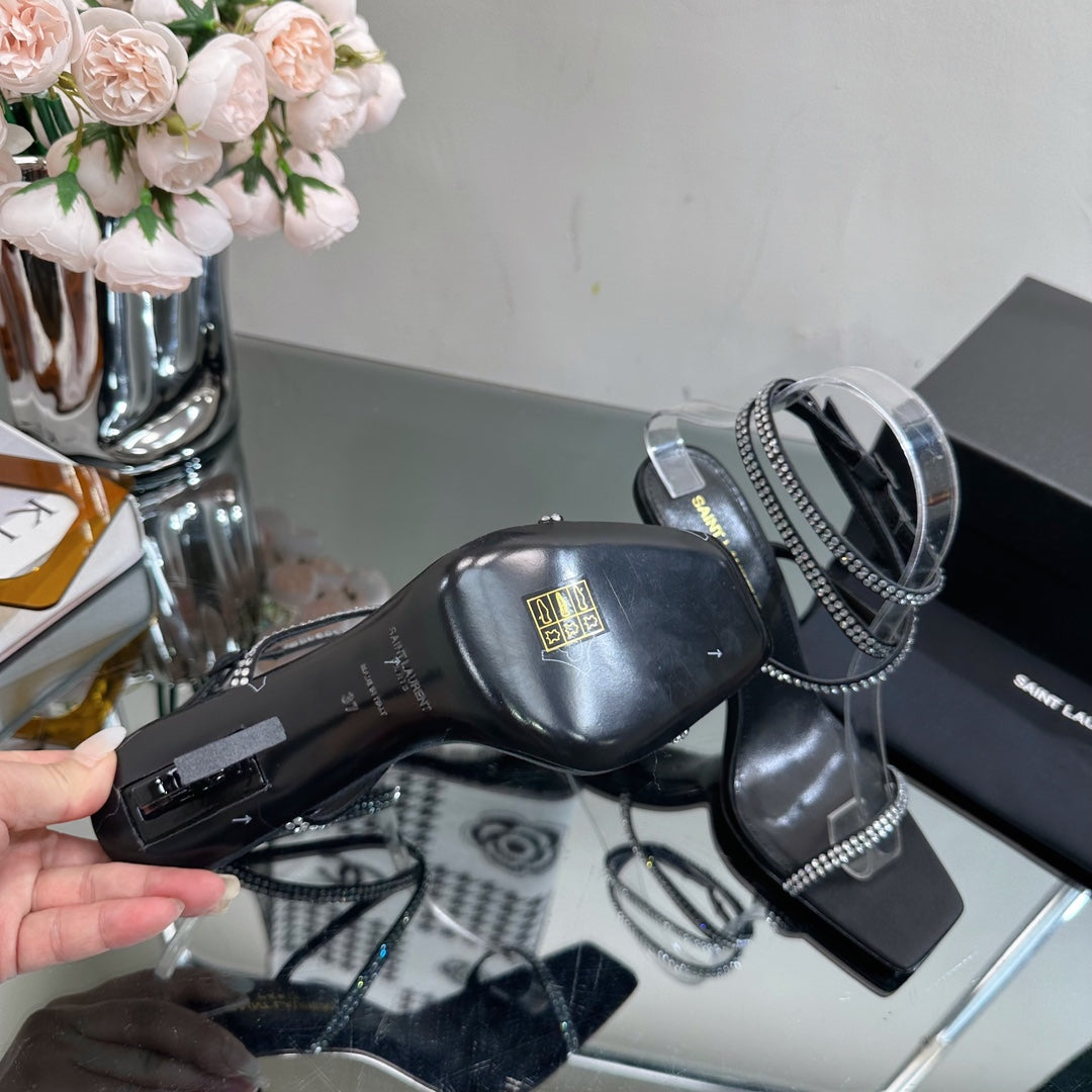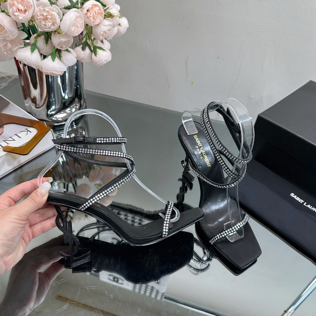SL OPYUM WHITE CRYSTAL HEELED SANDALS BLACK SATIN