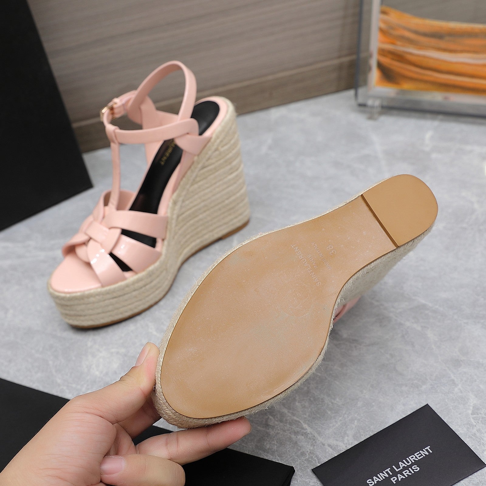 SL TRIBUTE WEDGE SANDALS PASTEL PINK POLISHED CALFSKIN